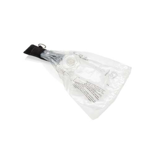 Small CPR face shield for mouth to mouth resuscitation, in webbing style pouch with velcro closure and steel keyring. Conform EN 13485:2016. With non-return valve. Note: This item can only be printed in black.